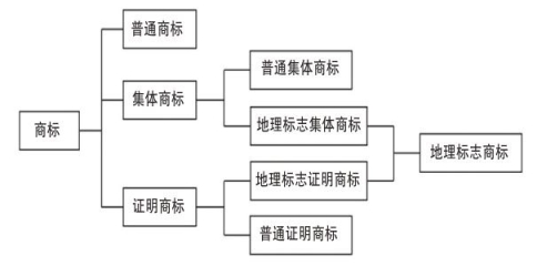 商标法第十六条定义“地理标志”为“标示某商品源于某地区,其特定质量、信誉等特征主要由该地区自然或人文因素决定的标志”。配套的商标法实施条例第四条规定,商标法第十六条规定的地理标志,可依相关规定作为证明商标或集体商标申请注册。这进一步细分集体商标、证明商标为地理标志集体商标和普通集体商标、地理标志证明商标和普通证明商标(如右图),地理标志集体商标和地理标志证明商标统称地理标志商标。